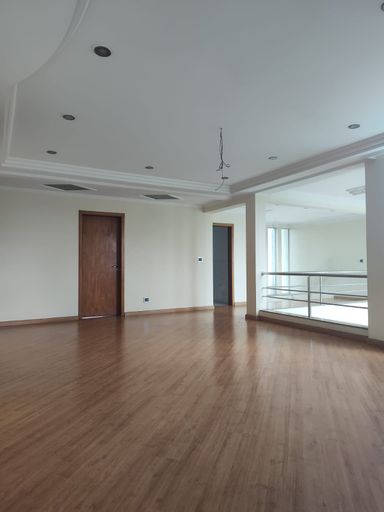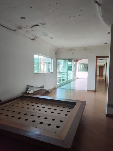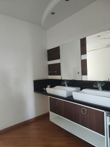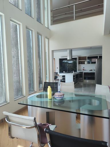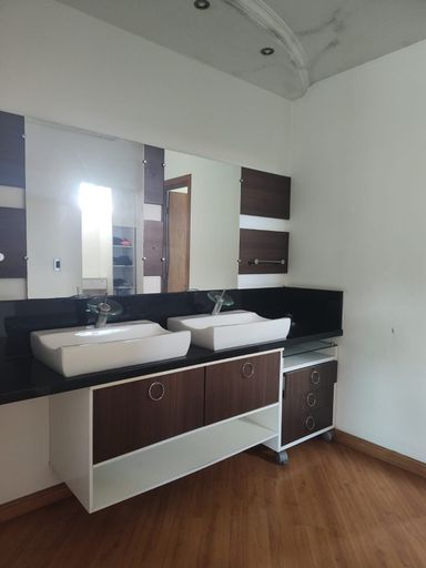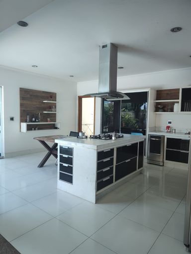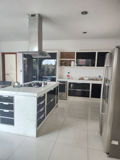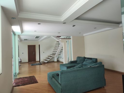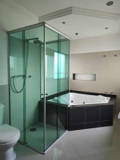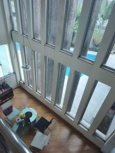 No pavimento inferior, lado esquerdo da entrada, há um espaço independente com sala, cozinha e quarto com hidromassagem, originalmente planejado para os pais.