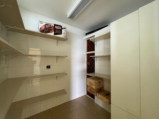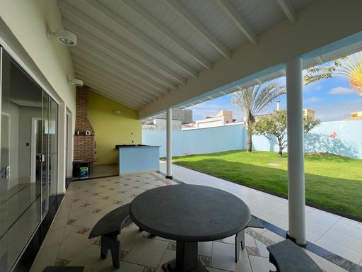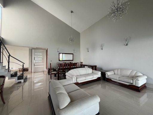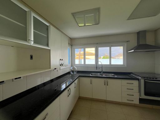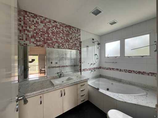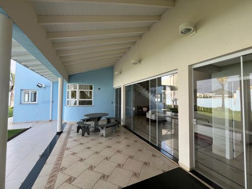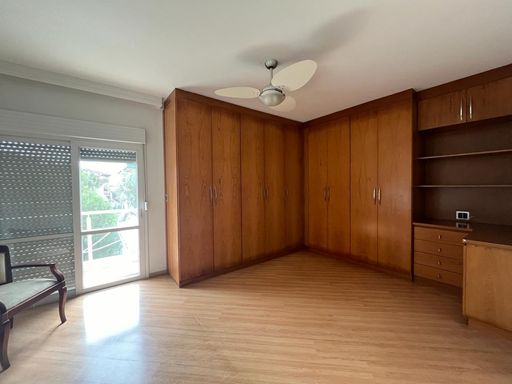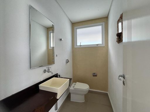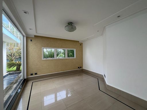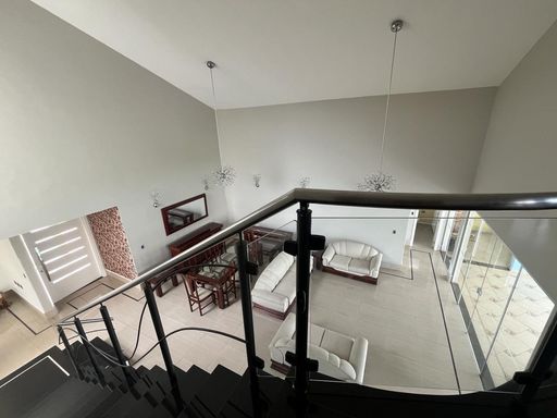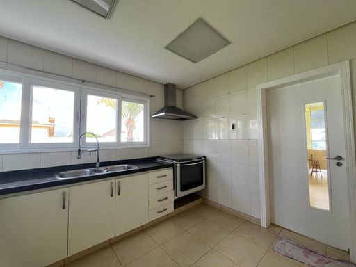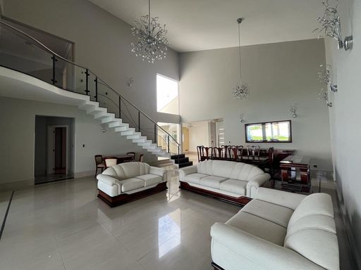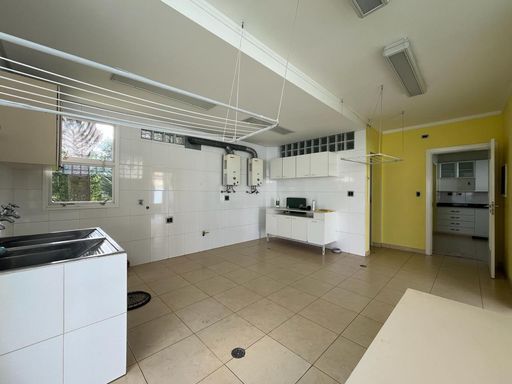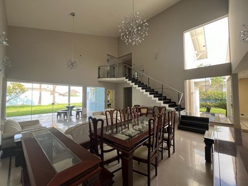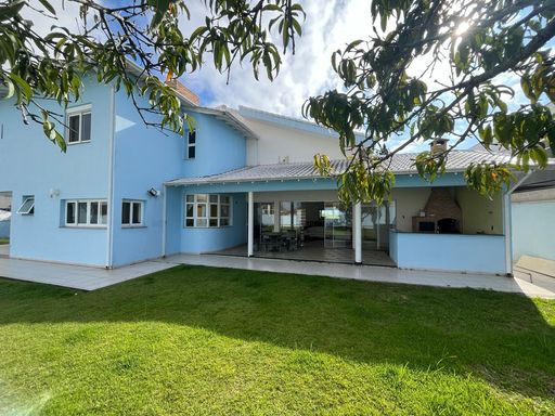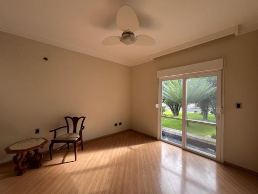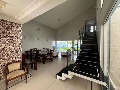 No térreo possui sala de TV, sala de jantar, sala de estar, escritório, lavabo, copa, cozinha, despensa, lavanderia, banheiro externo e área de churrasqueira integrada com a casa.
